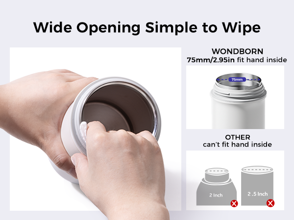 The wide opening (75mm / 2.95in) makes a big difference when you're on the go. Between feedings, you can easily reach inside and wipe it clean with a tissue or wipe—no need to find a sink every time. It’s a small detail that solves a big problem many parents don’t realize until they’re outside with their baby.
