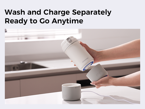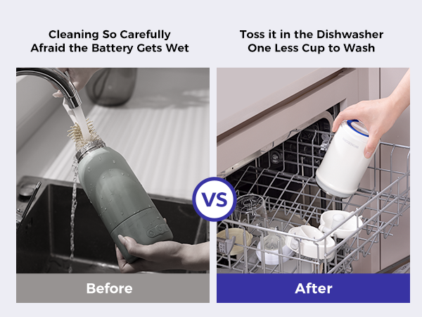 Simply remove the base before washing—so the cup can go straight into the dishwasher while the battery stays dry and continues charging.