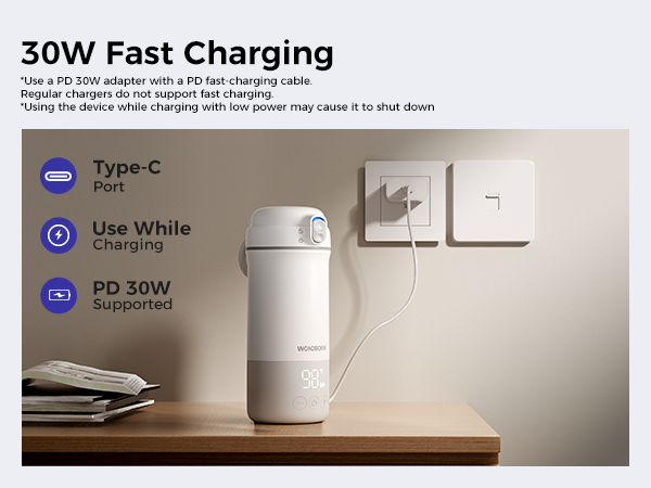 Long Battery Life: Equipped with a high-quality 12,800 mAh battery, it can heat 4 oz of water up to 15 times on a single charge—perfect for a full day of feeding. Supports PD30W fast charging and is compatible with various adapters, fully recharging in just 2 hours so you're always ready to go.
