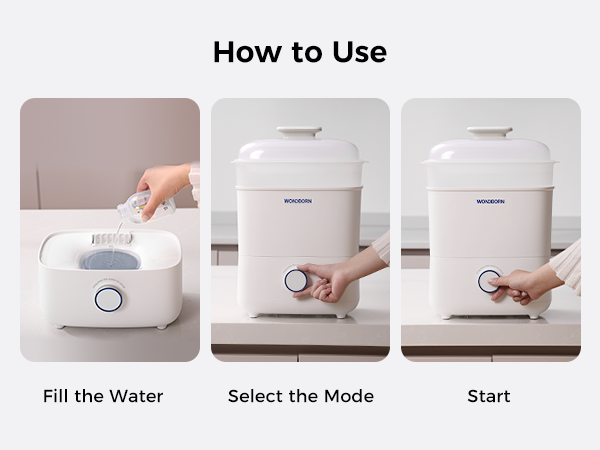 Step 1: Add water to the heating plate up to the MAX line. Step 2: Select your desired mode (Auto, Dry Only, or Sterilize Only).