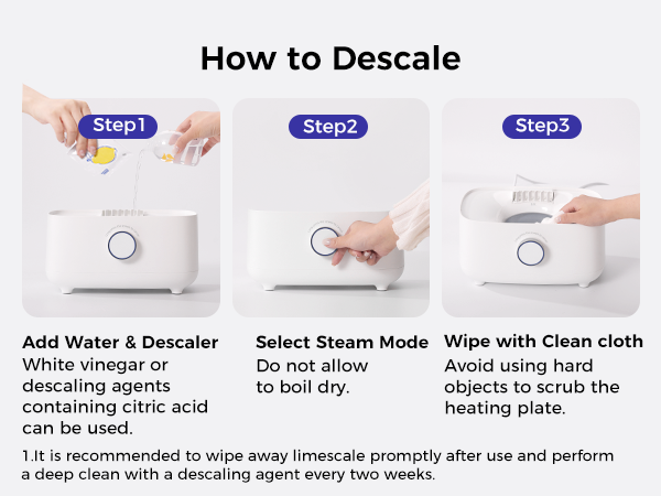 Daily Cleaning: After daily use, wipe the heating plate with a damp cloth to prevent the buildup of water scale. Regular Maintenance: Due to minerals present in the water, water scale may accumulate on the heating plate over time. Regular descaling can be performed using WONDBORN citric acid descaler.
