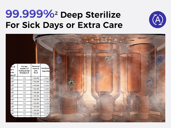 - 99.999% High-Efficiency Deep Sterilization: Choose the 6-minute quick sterilization cycle to eliminate 99.9% of common bacteria, or switch to Auto Mode for deep sterilization that kills up to 99.999% of bacteria. No boiling water or microwave heating needed—keep your baby’s feeding essentials safe, hygienic, and always ready to use