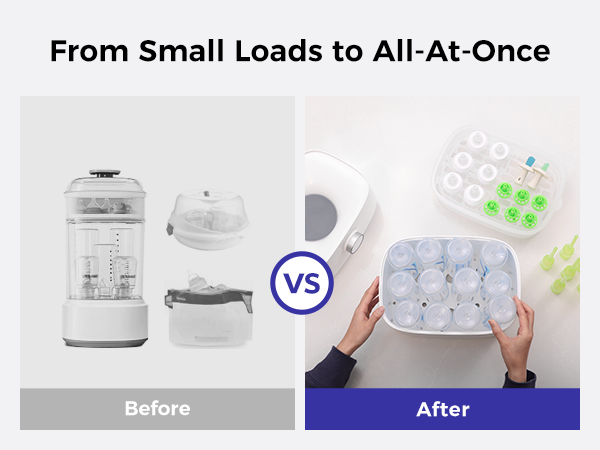 - Universal Compatibility: Designed with extra interior space and height to fit more baby essentials. Compatible with 8oz standard-neck bottles as well as other popular brands. Perfect for sanitizing both wearable and traditional breast pump parts — meeting every mom’s daily sterilizing needs