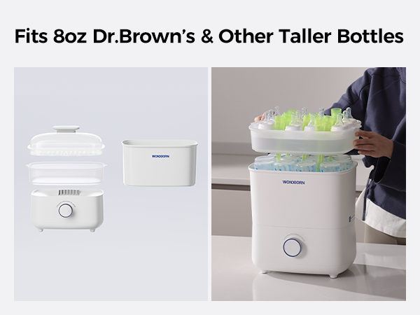 Dr. Brown’s 8-oz bottles are taller than most other brands, meaning users of these bottles have long had very limited options for sterilizers. Our sterilizer has been specifically customized and improved to accommodate Dr. Brown’s 8-oz bottles without sacrificing any space or functionality. Truly, this is the most compatible sterilizer for Dr. Brown’s 8oz Standard-Neck tall bottles.